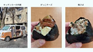 I bought some rice balls "Smoked radish pickled & cheese," "Plum mackerel," and "Kimchi" from the food truck "Onigiri ag...
