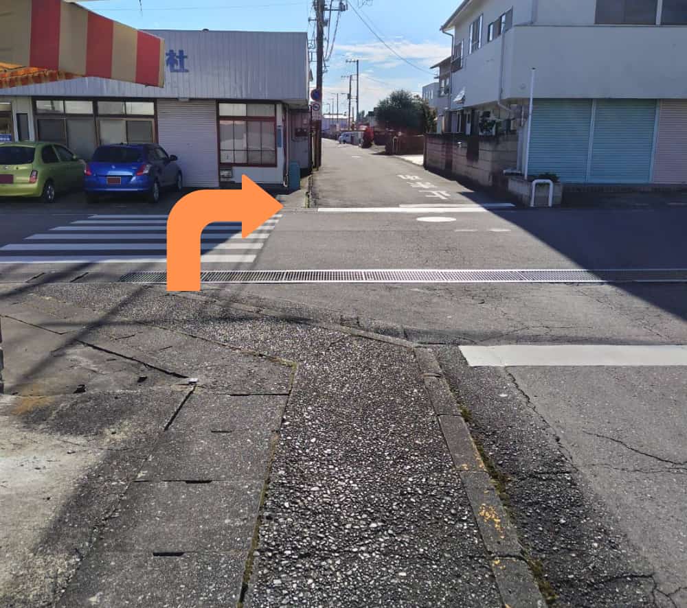 4分ほど歩くと横断歩道が見えてくるので、横断歩道を渡って右折