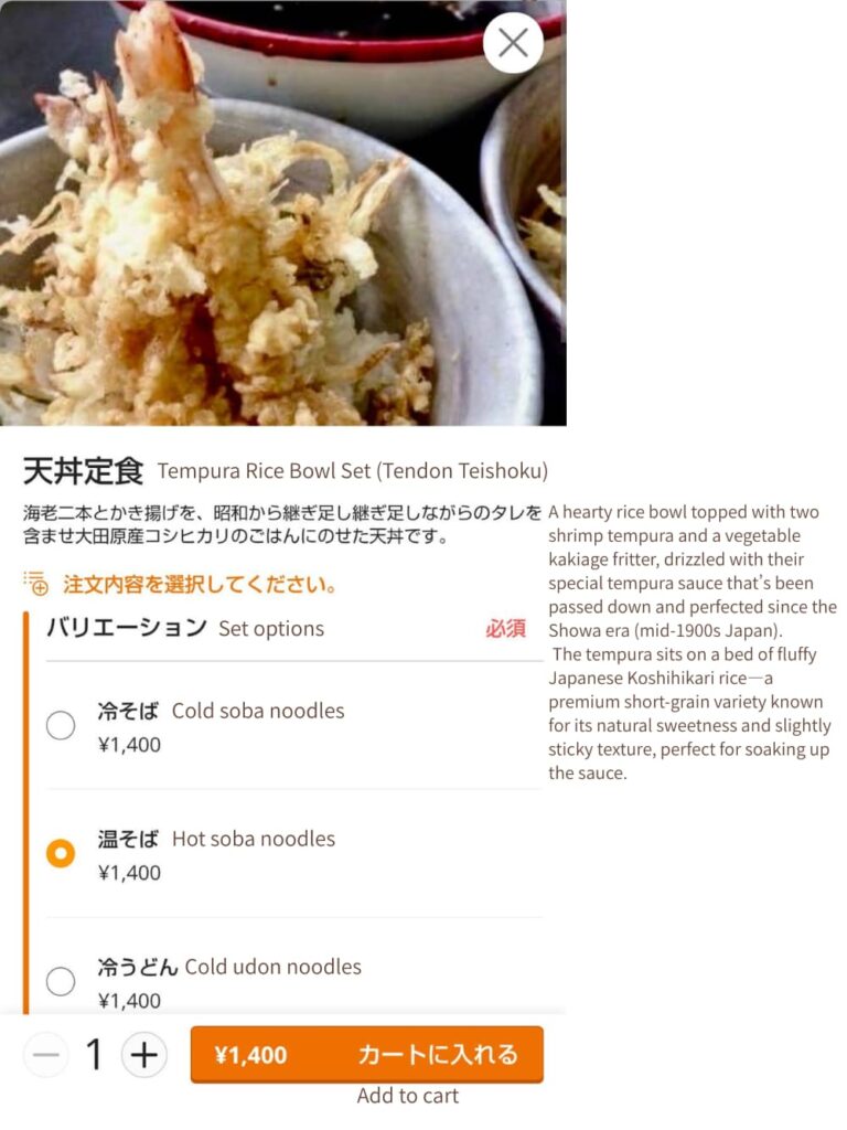 ・Tempura Rice Bowl Set (with hot soba, ¥1400)