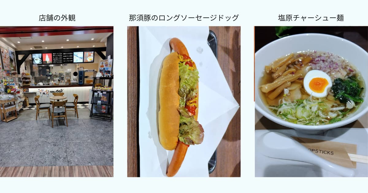 那須塩原駅2Fの【Nasu Cafe’】で出張前に腹ごしらえ!「塩原チャーシュー麺」と「那須豚のロングソーセージドッグ」を頂きました。