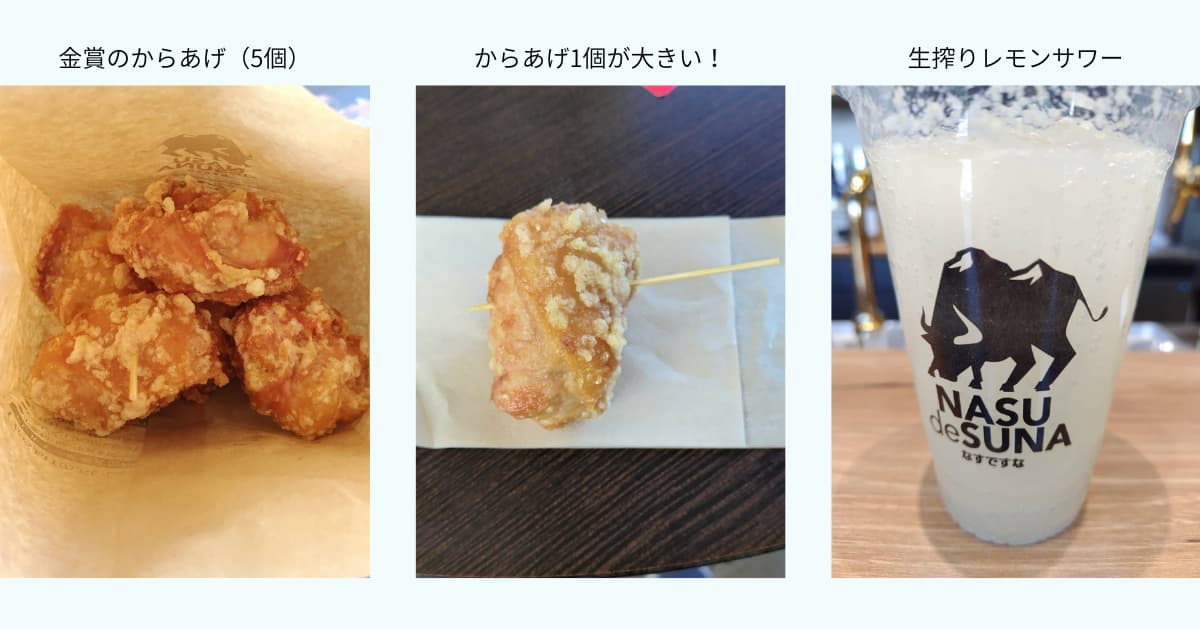 那須ガーデンアウトレット内のNASUdeSUNAに再訪。生搾りレモンサワー&金賞のからあげ(5個)を楽しみました。