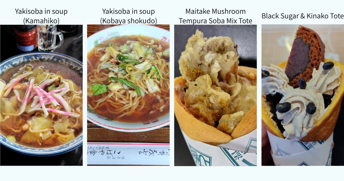 - Tote-yaki: Maitake mushroom tempra soba mix tote (500円)
